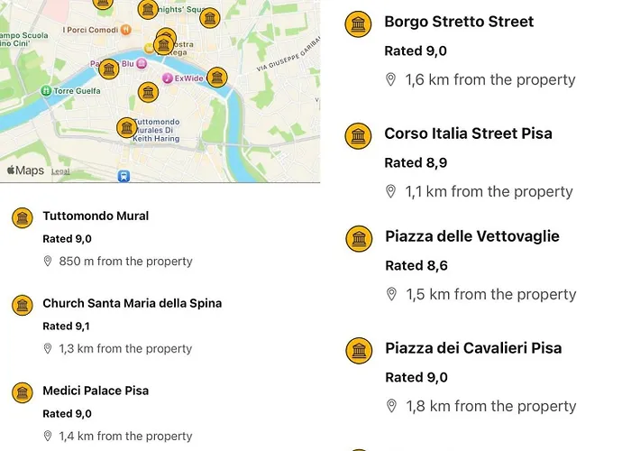 Pisa központja 20 perc sétával elérhető, az olyan sportlátványosságok pedig, mint az Arena Garibaldi, kocsival 10 percre vannak. A nemrég felújított hotel körülbelül 2,1 km-re fekszik a Dóm tértől. A Parco Urbano SS. Cosma e Damiano ugyancsak közel található a Pisa városi B&B Prime Sant'Agostino. A Pisa városi ingatlan egy 5 perces sétára van a Rentcar Shuttle buszmegállótól.